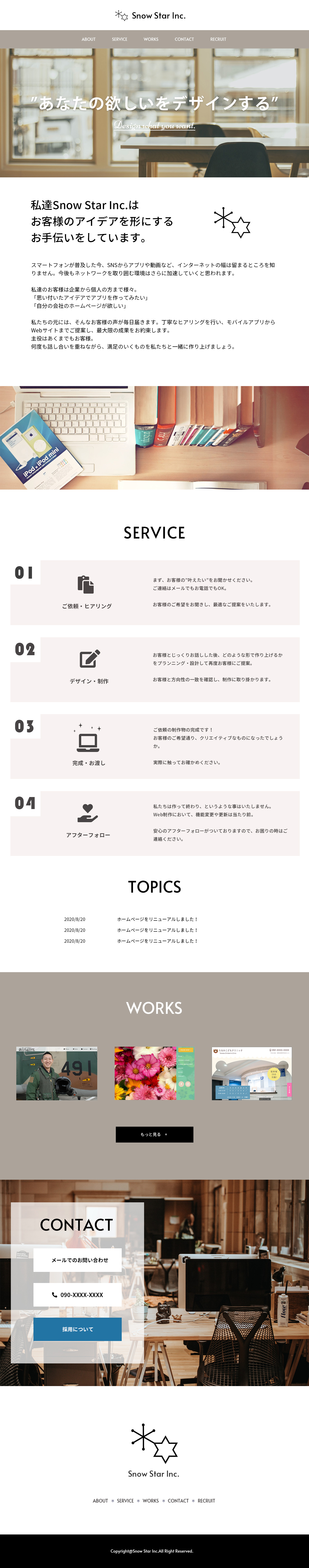 - 個人から企業までターゲットとする架空のスタートアップのWeb制作会社を想定して制作しました。会社のブランドイメージがつくように、クールで上質なイメージでデザインしました。個人のお客様にも親しみを持たれるように、すっきりとした中にも少し温かみを持たせるよう配色を工夫しました。