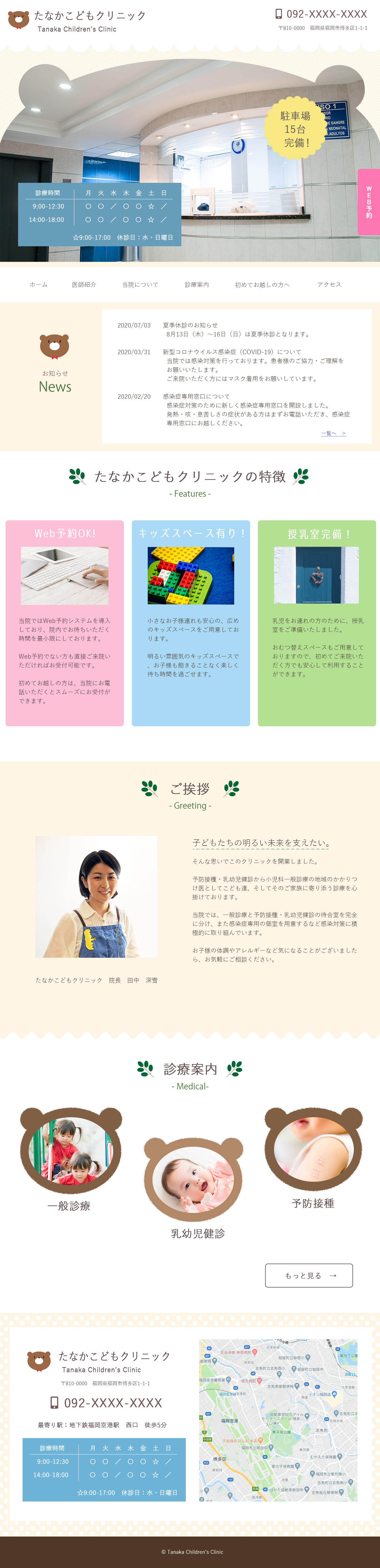 - 「子供が行きたくなる」「子供を連れて行きやすい」クリニックであることが伝わるように、すっきりとした中にも可愛らしさを感じられるように制作しました。クマのキャラクターや葉っぱのイラストを用い、全体的に優しい雰囲気に仕上げました。